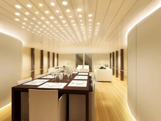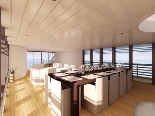 According to Lord Foster the design has been influenced by the firms' experience on terra firma: "We have given a new emphasis to such issues as quality and quantity of space, outdoor terraces, light and views. Our work on luxury hotels and residences has also informed a fresh approach to achieving privacy and comfort, here in the context of a nautical tradition."