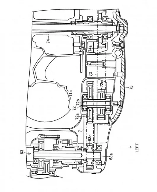 Here's how it works:the bike uses a complex array of ring gear, planetary gears and a sun gear to combine the two power units. The Ring gear is connected to the electric motor via a clutch and permanently attached via a chain to reduction gears and the rear wheel. The four Planetary gears are mounted on a disc driven by the petrol engine and the Sun gear is connected directly to the generator.