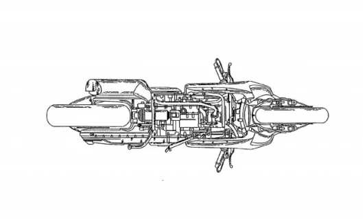 Rather than relying on a conventional frame, the engine, transmission, swingarm and rear shock are all a single, stand-alone unit. The swingarm is bolted straight to the engine/transmission unit, with a horizontal rear shock underneath, with its ends attached to the bottom of the arm and the underside of the transmission.