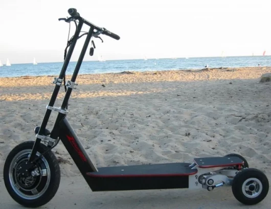 The Zuumer is basically a lithium-ion battery powered cross between a skateboard and a trike. It achieves maximum speed of up to 20 mph with a range of 20 miles before recharging is required, but the stand-out feature and the key to its exceptional handling characteristics is the articulated, "carving" rear-wheel set-up which enables the rider to steer by leaning rather than relying solely on the handlebars.